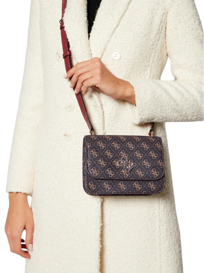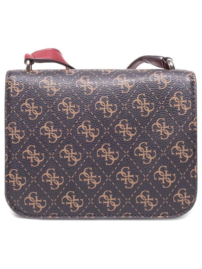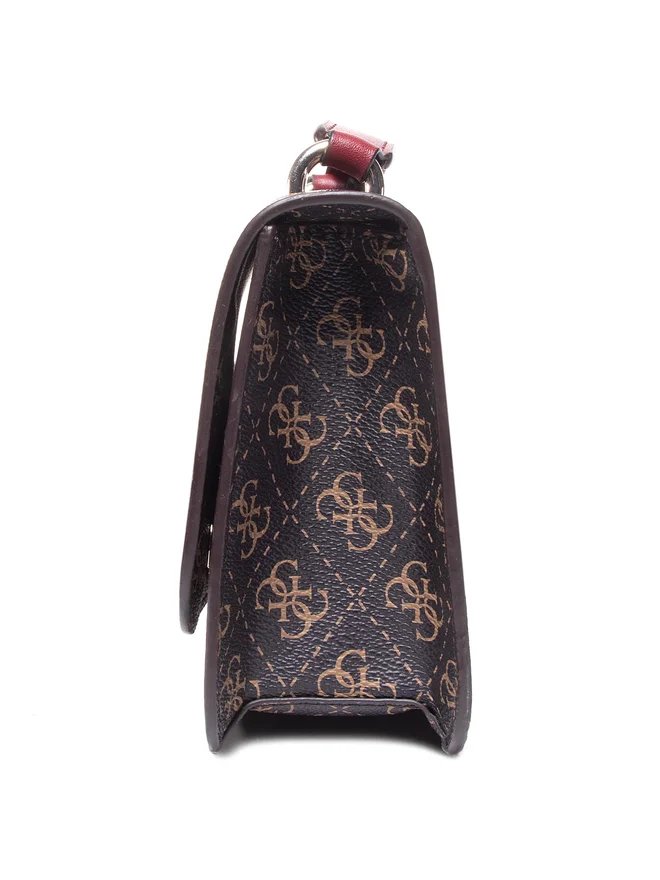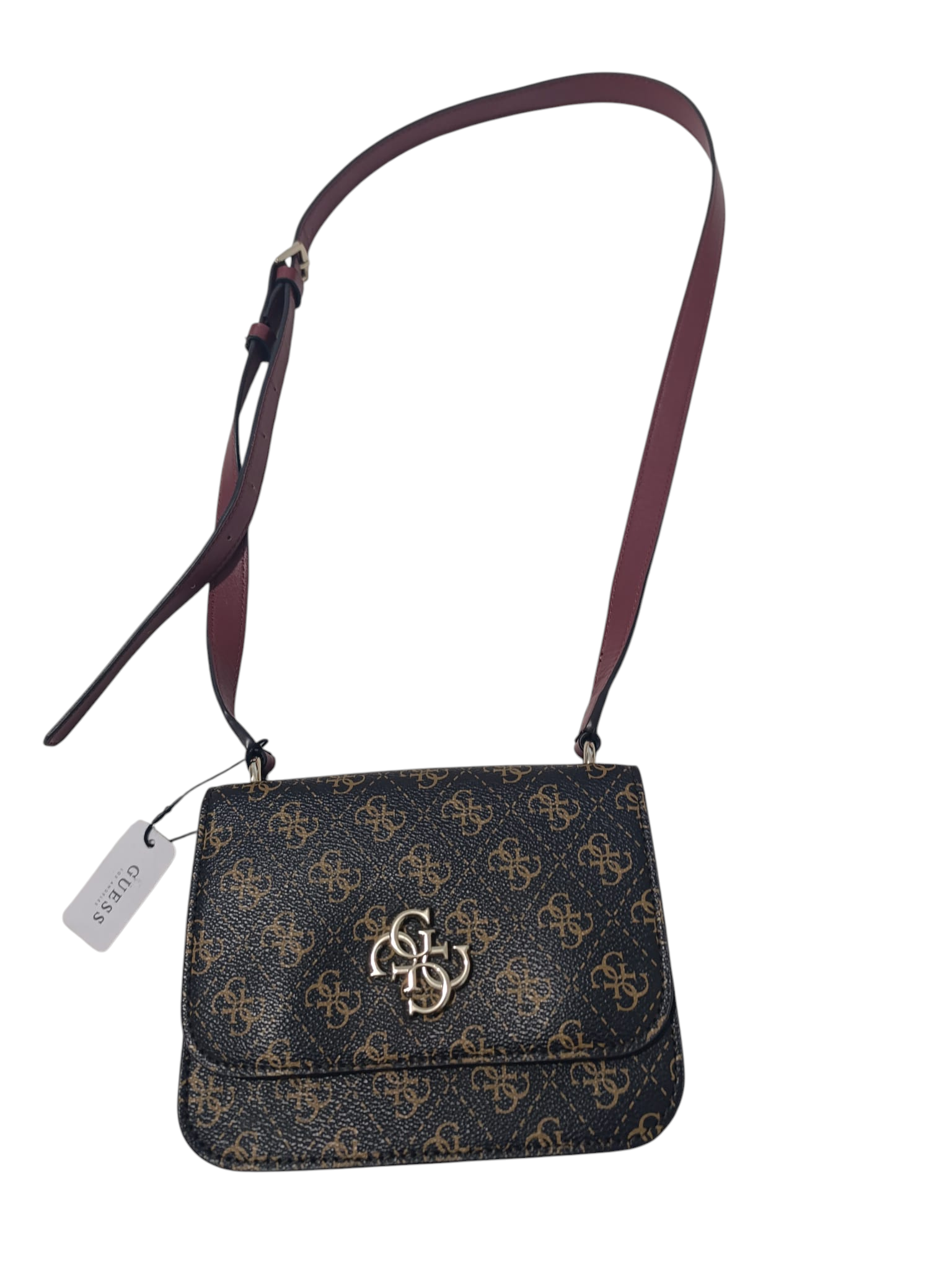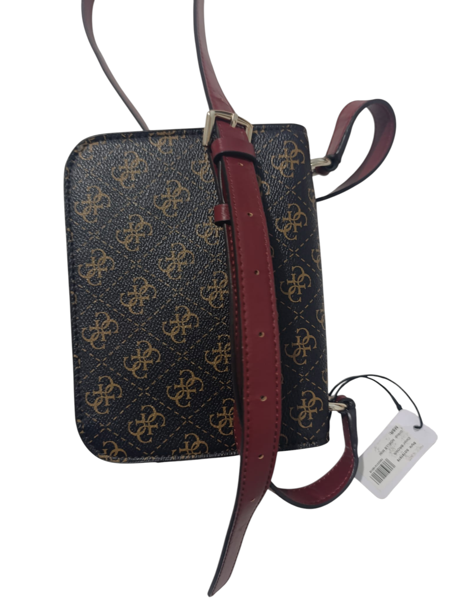 Bolso GUESS Mini Noelle con monograma dorado sobre fondo negro y correa burdeos ajustable. Un diseño elegante, compacto y versátil, ideal para el día a día o para completar looks sofisticados. Autenticidad garantizada.
