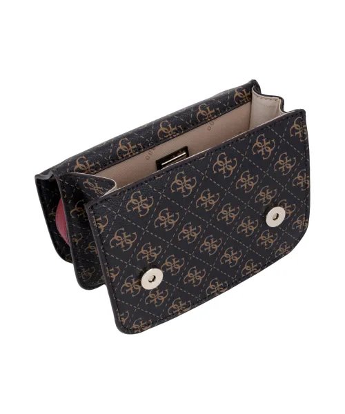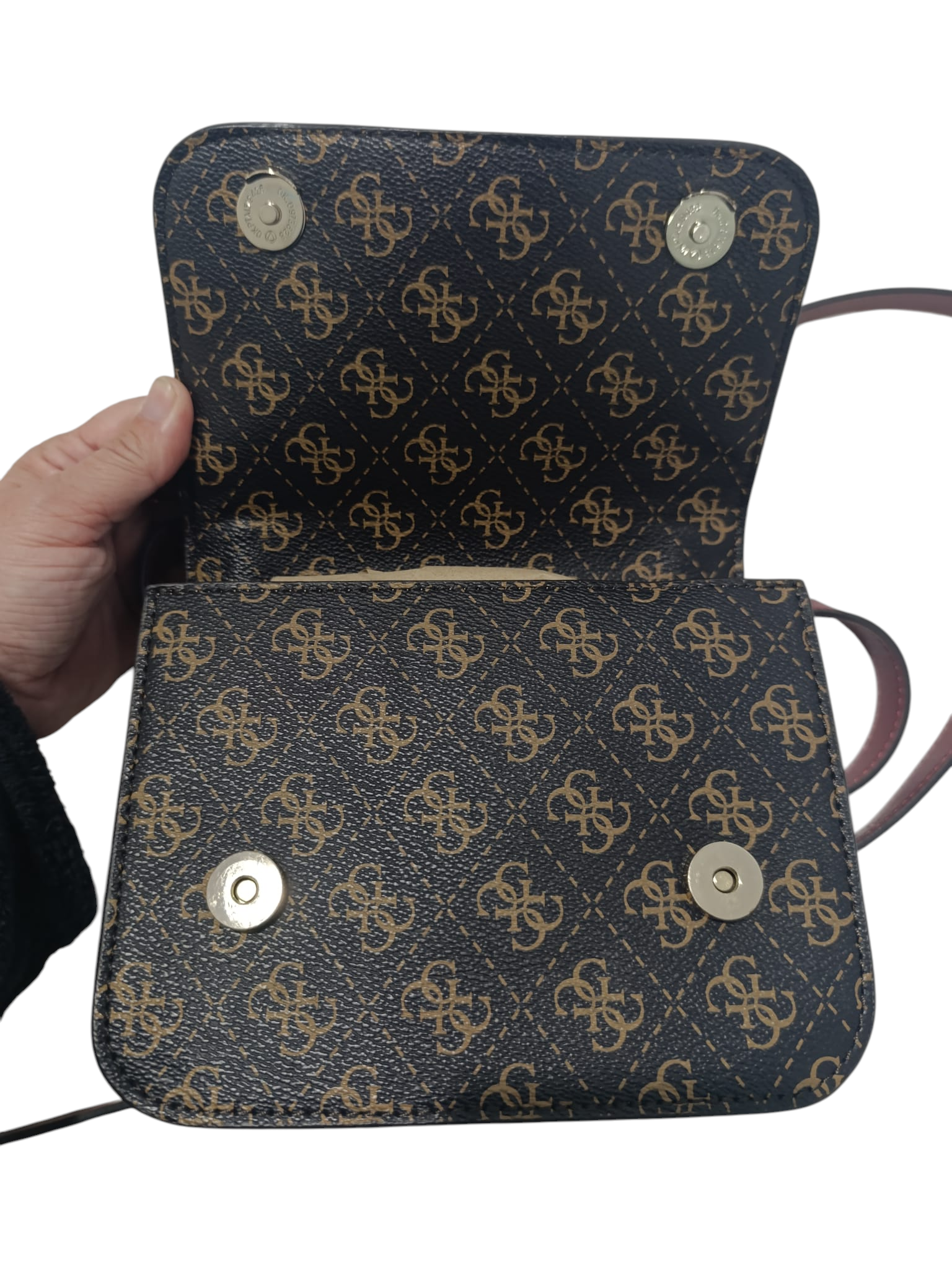 Bolso GUESS Mini Noelle es un accesorio imprescindible para quienes buscan estilo, calidad y diseño en un formato compacto. Su exterior presenta el icónico monograma GUESS en tonos dorados sobre fondo negro, aportando un toque sofisticado y moderno que combina con cualquier look.