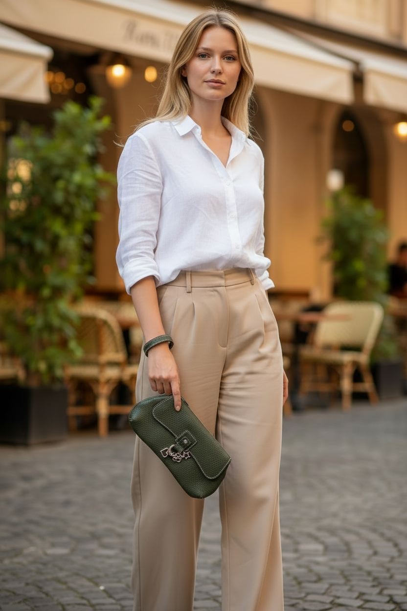 El tamaño compacto lo convierte en el accesorio ideal para llevar lo esencial con comodidad, mientras que su diseño minimalista y los detalles metálicos aportan un aire moderno y refinado. Perfecto para el día a día o para ocasiones especiales donde buscas un complemento discreto pero con personalidad.