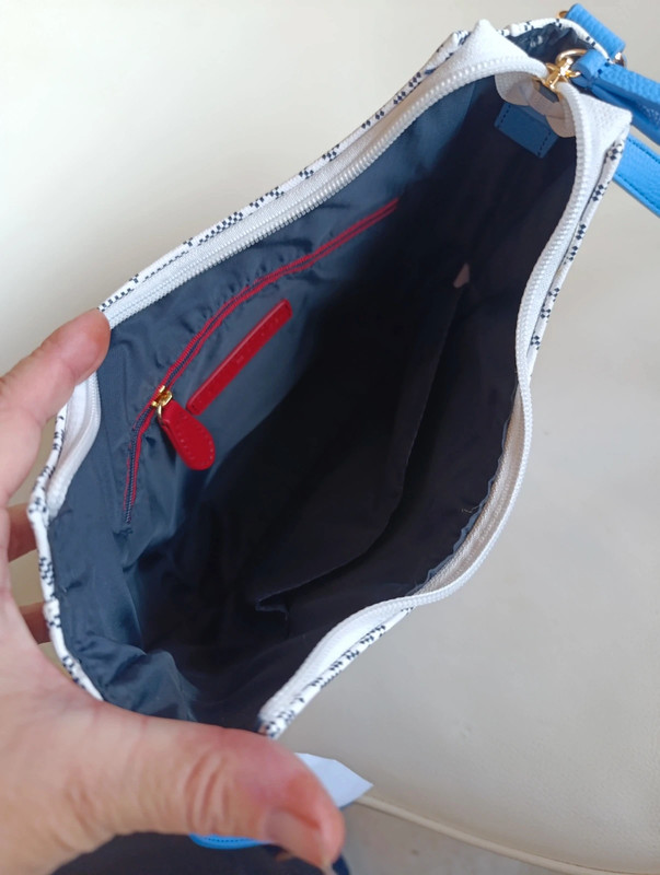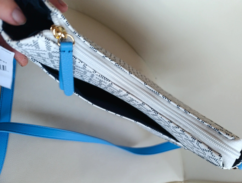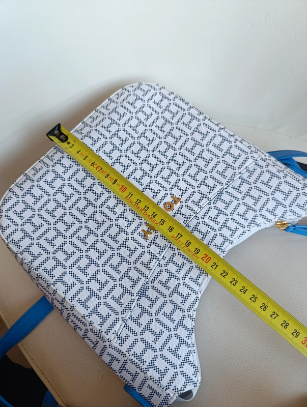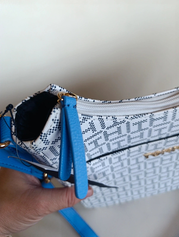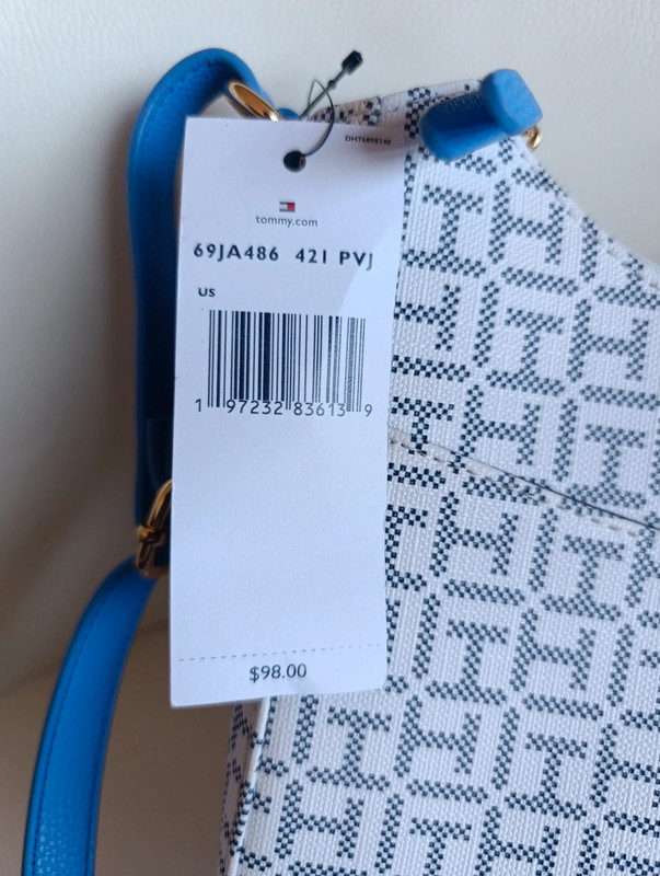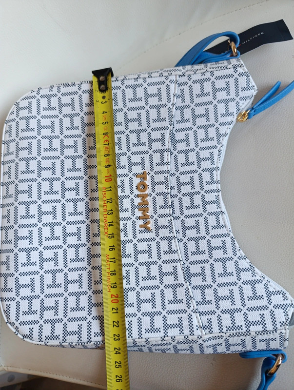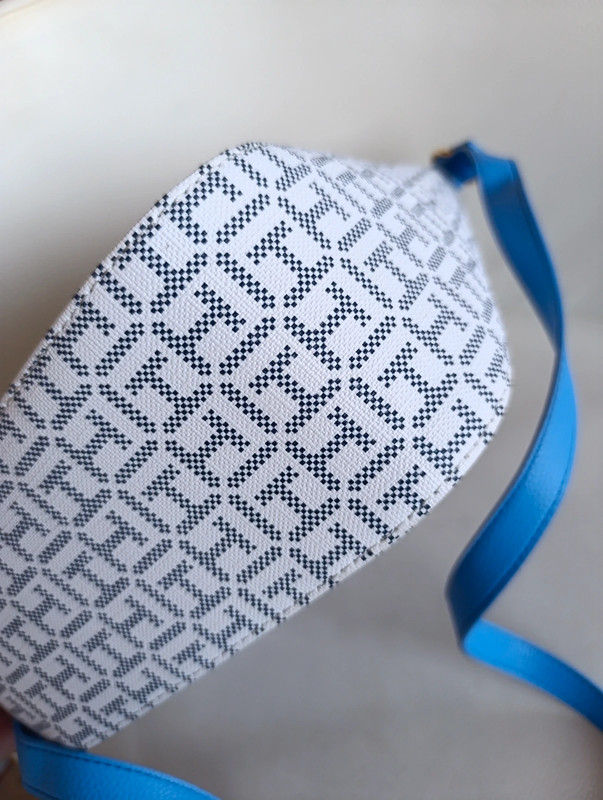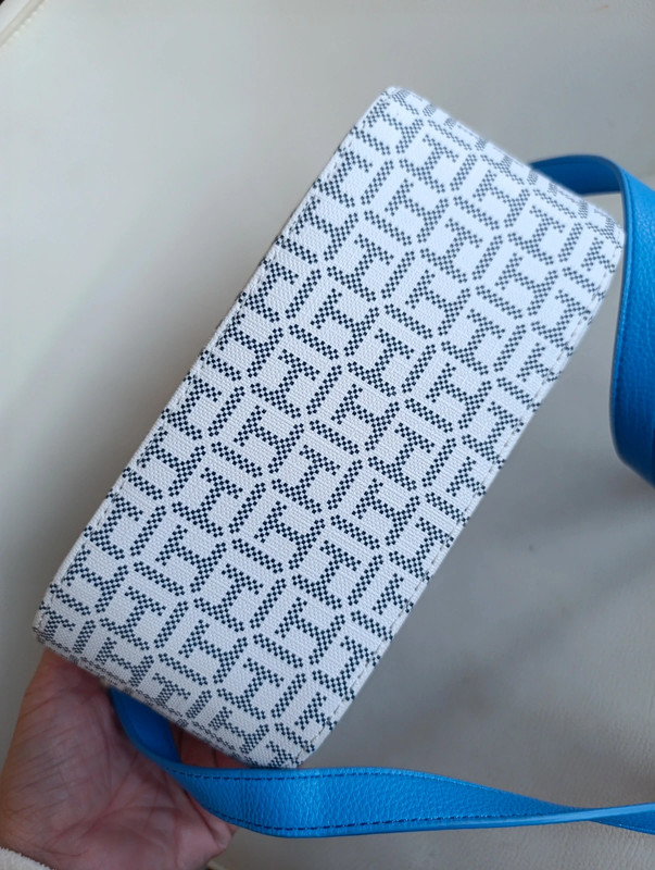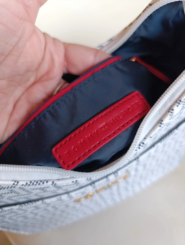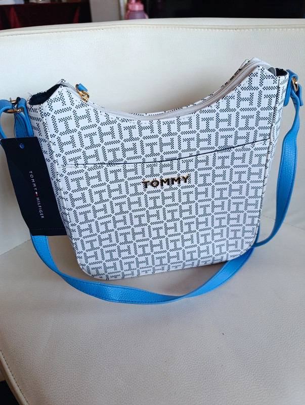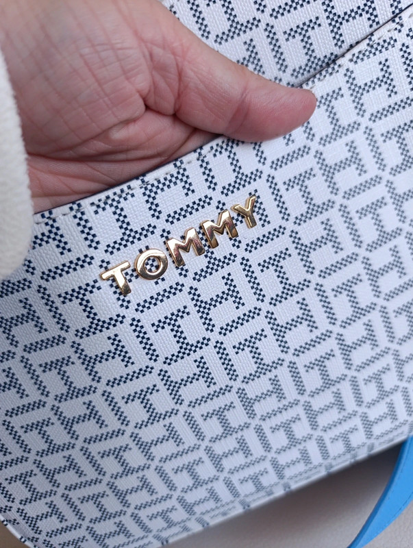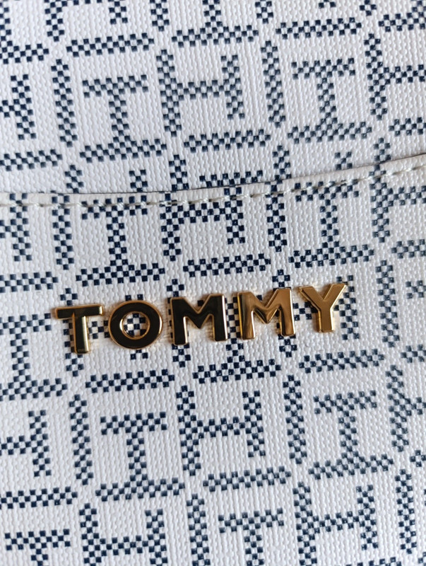 Bolso Tommy Hilfiger auténtico con acabado en monograma clásico. Trae bandolera ajustable para llevar cruzado o al hombro.