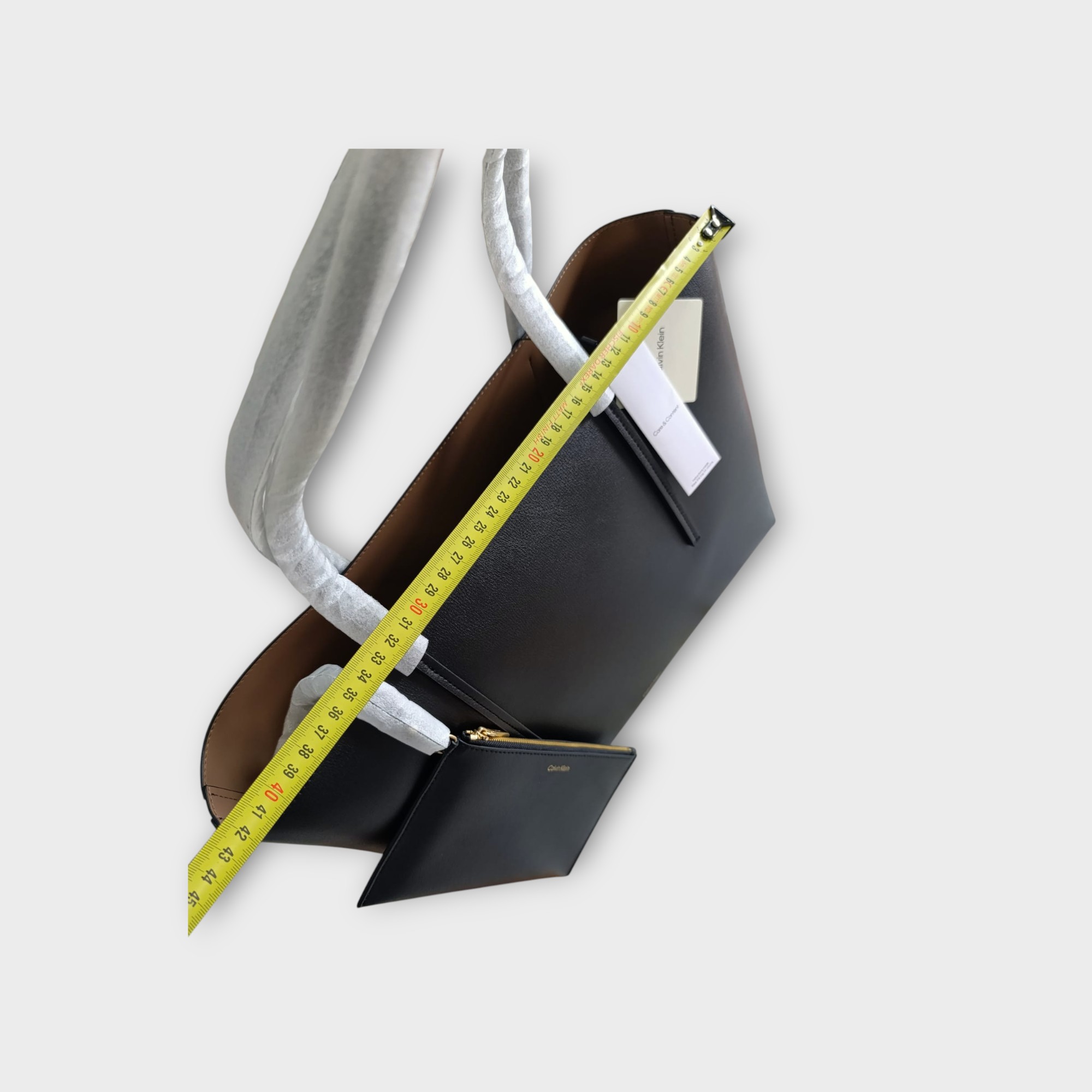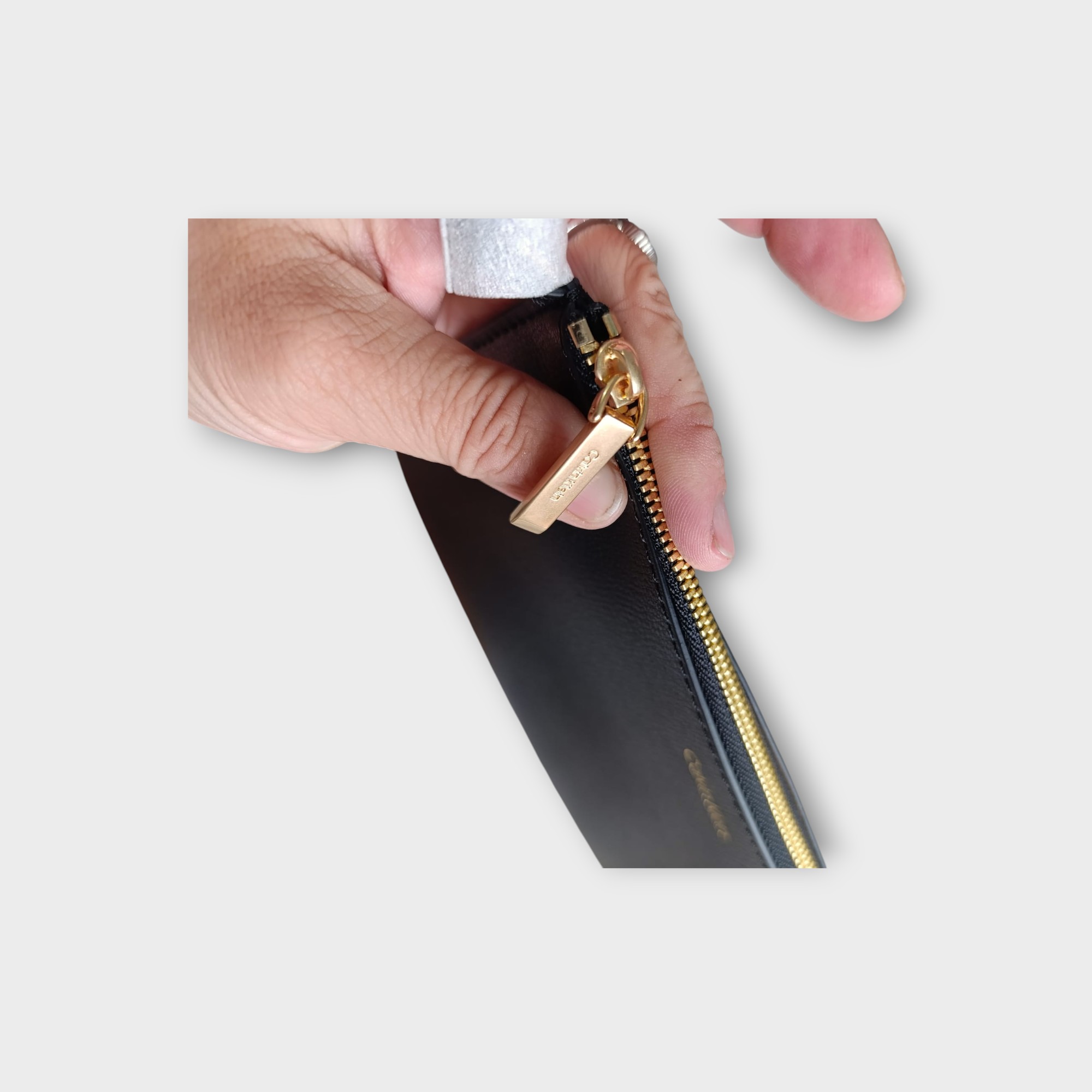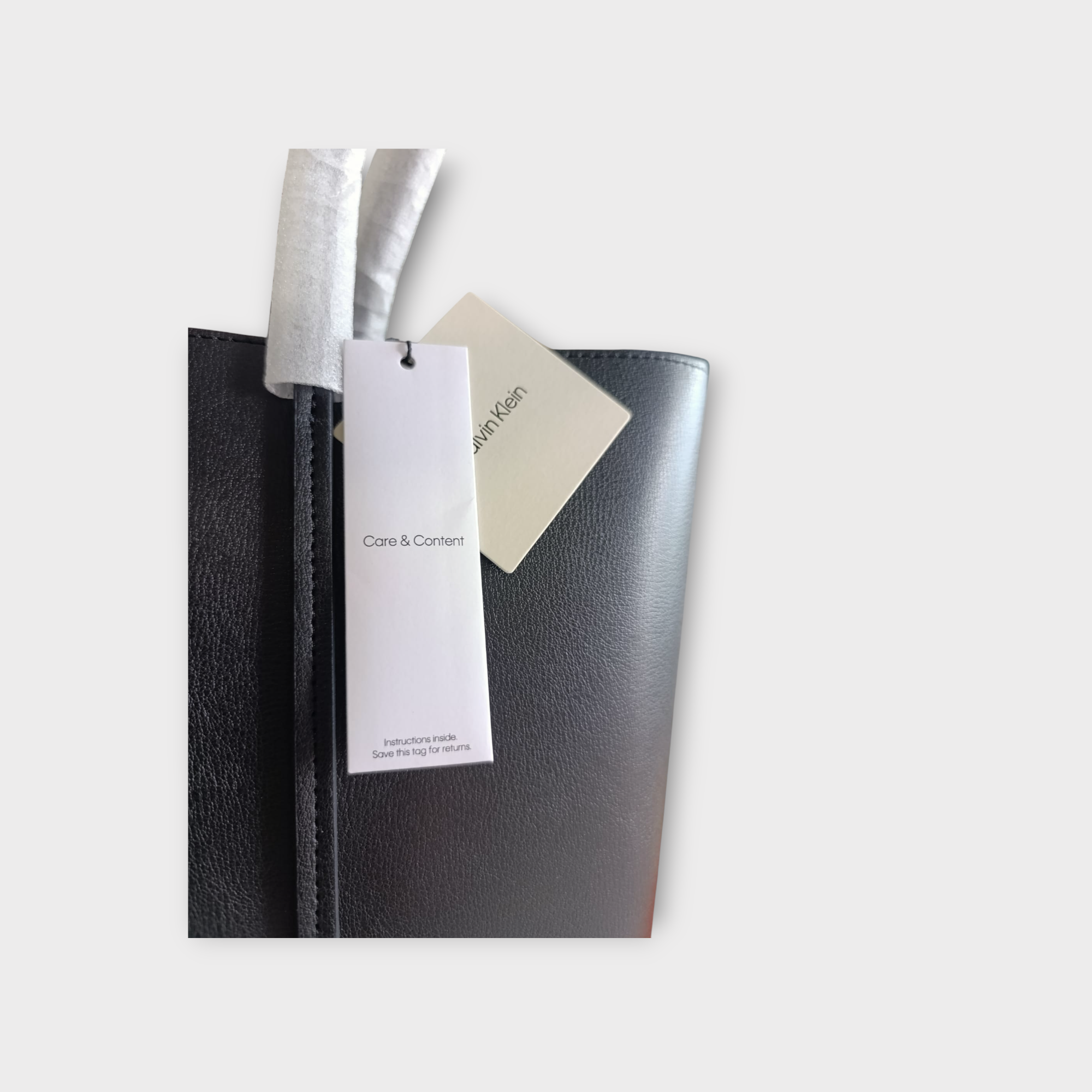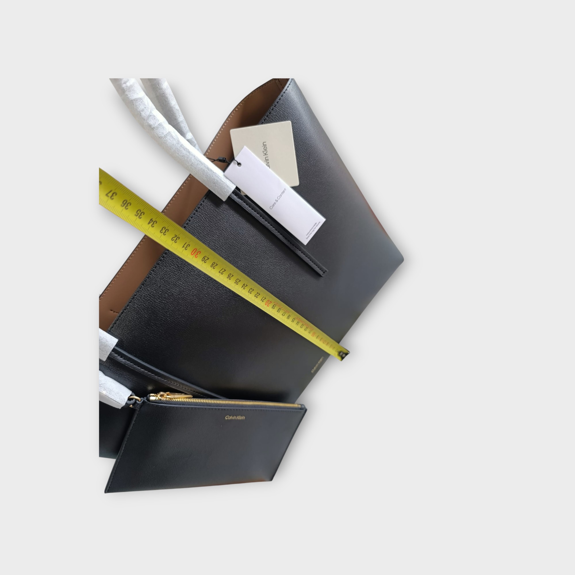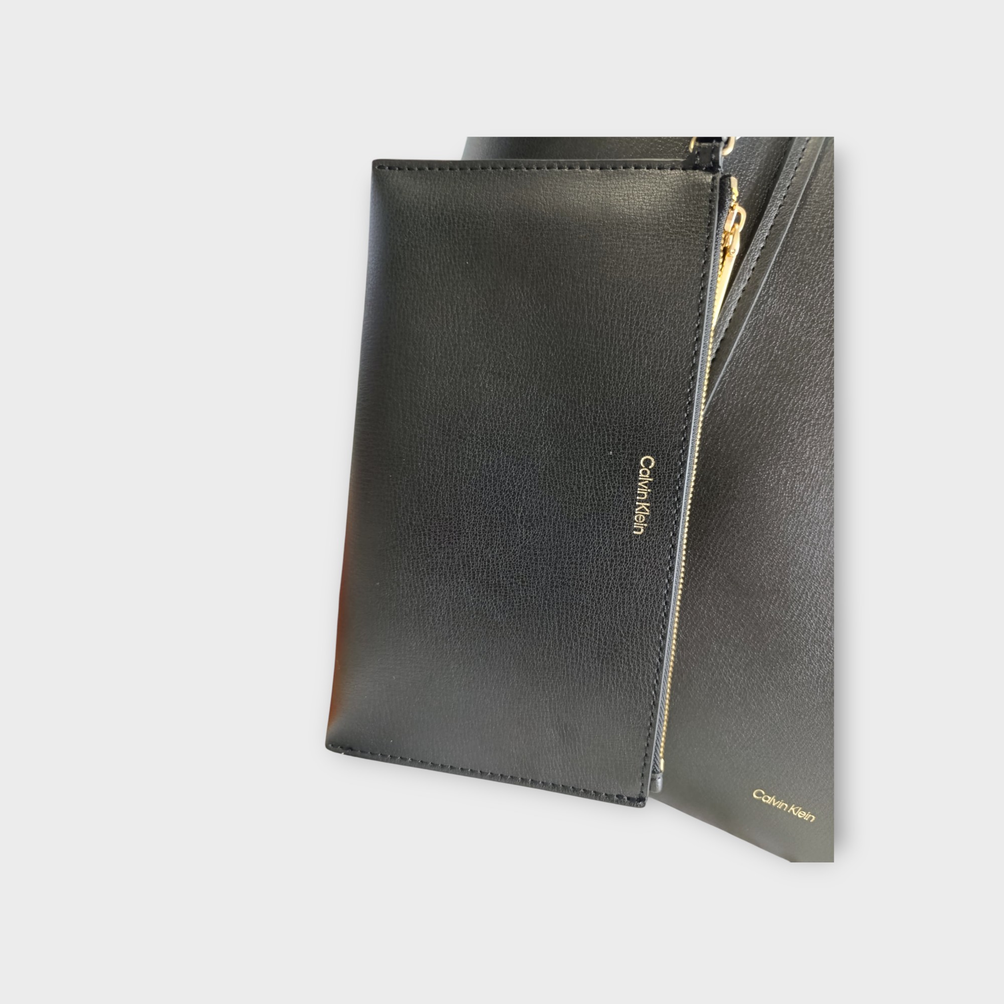 Bolso tote Calvin Klein en color negro, con diseño elegante y minimalista, ideal para uso diario, oficina o viajes. Fabricado en material tipo piel de alta calidad, ofrece amplio espacio interior y asas largas para llevar cómodamente al hombro. Incluye un pouch/monedero removible con cierre, perfecto para organizar objetos pequeños. Un bolso versátil y atemporal que combina con cualquier outfit.