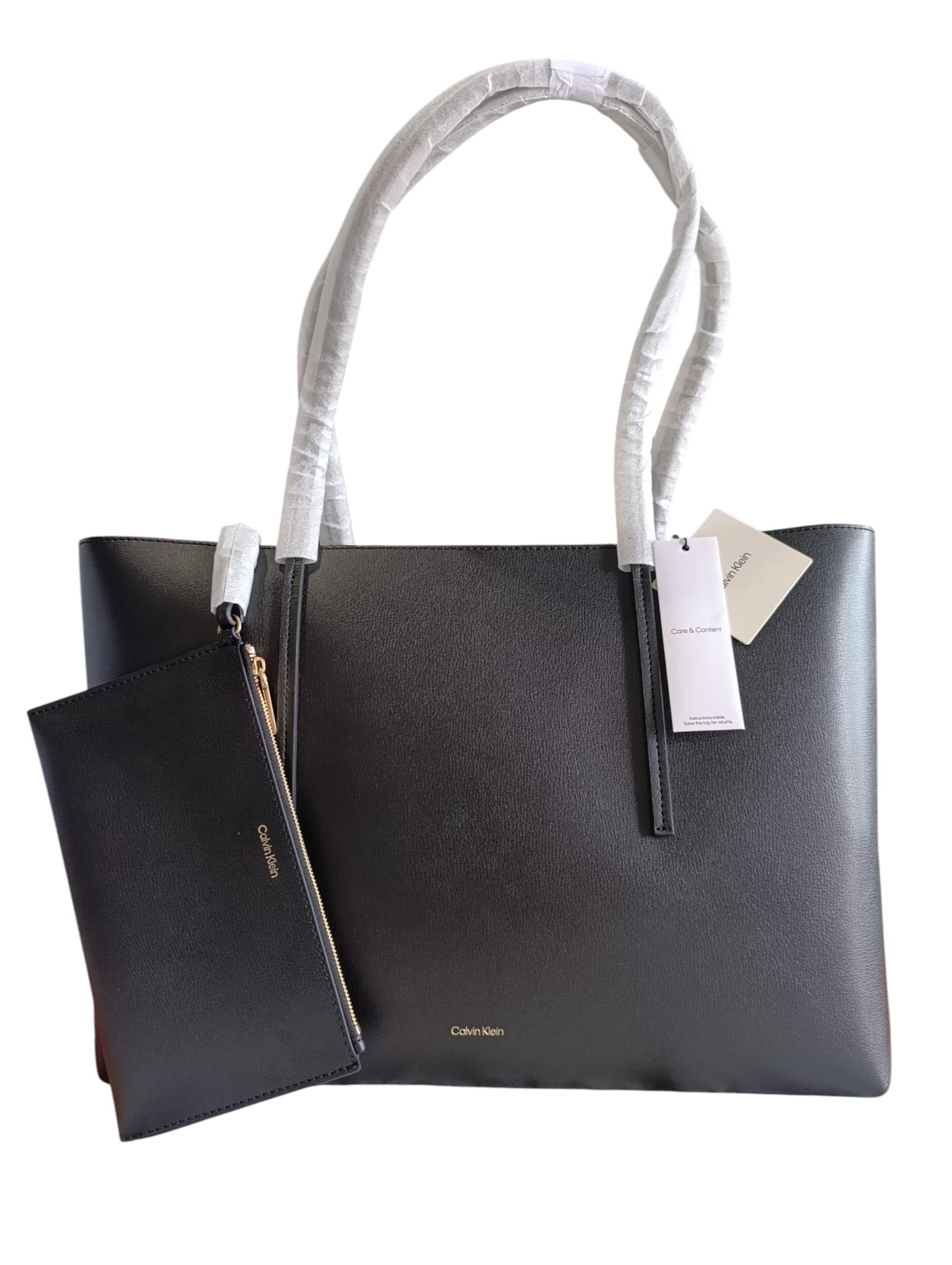 Bolso tote Calvin Klein negro para mujer, elegante y funcional. Incluye pouch interior con cierre. Ideal para trabajo y uso diario.