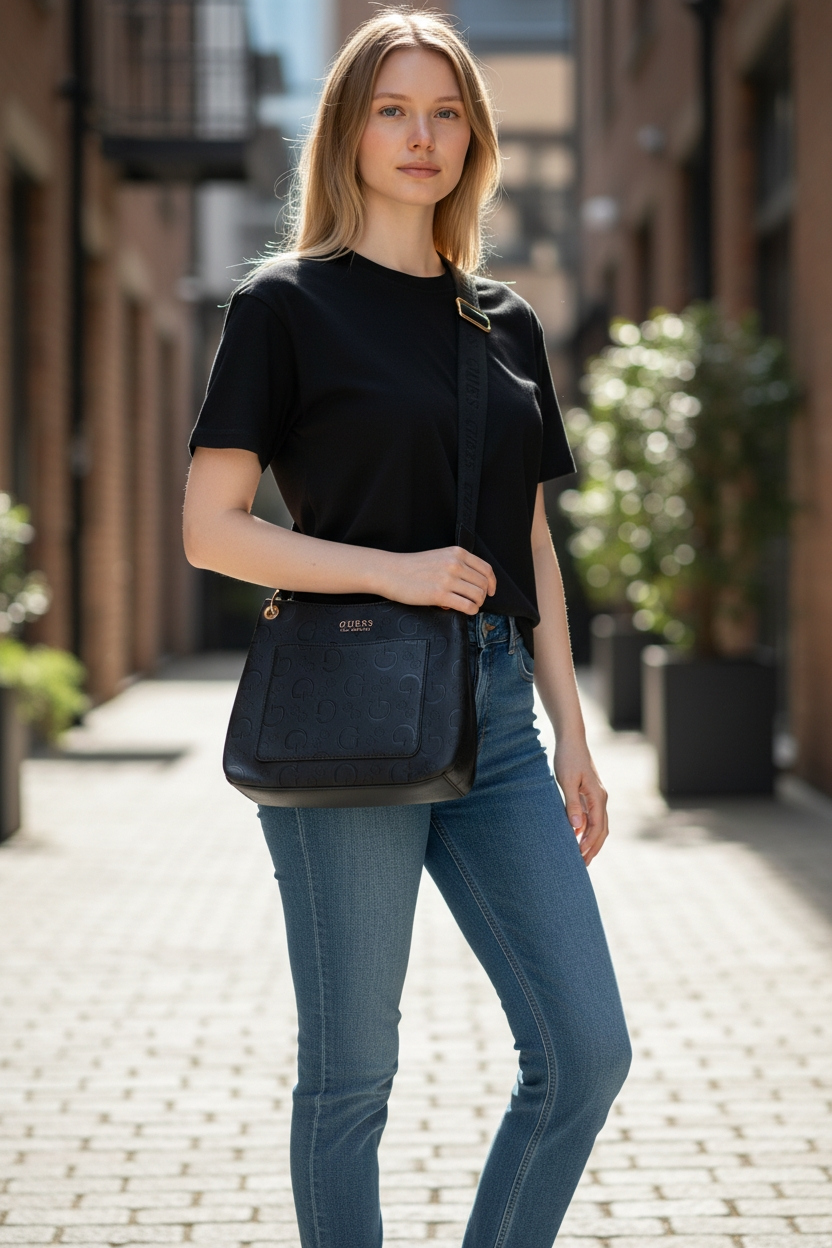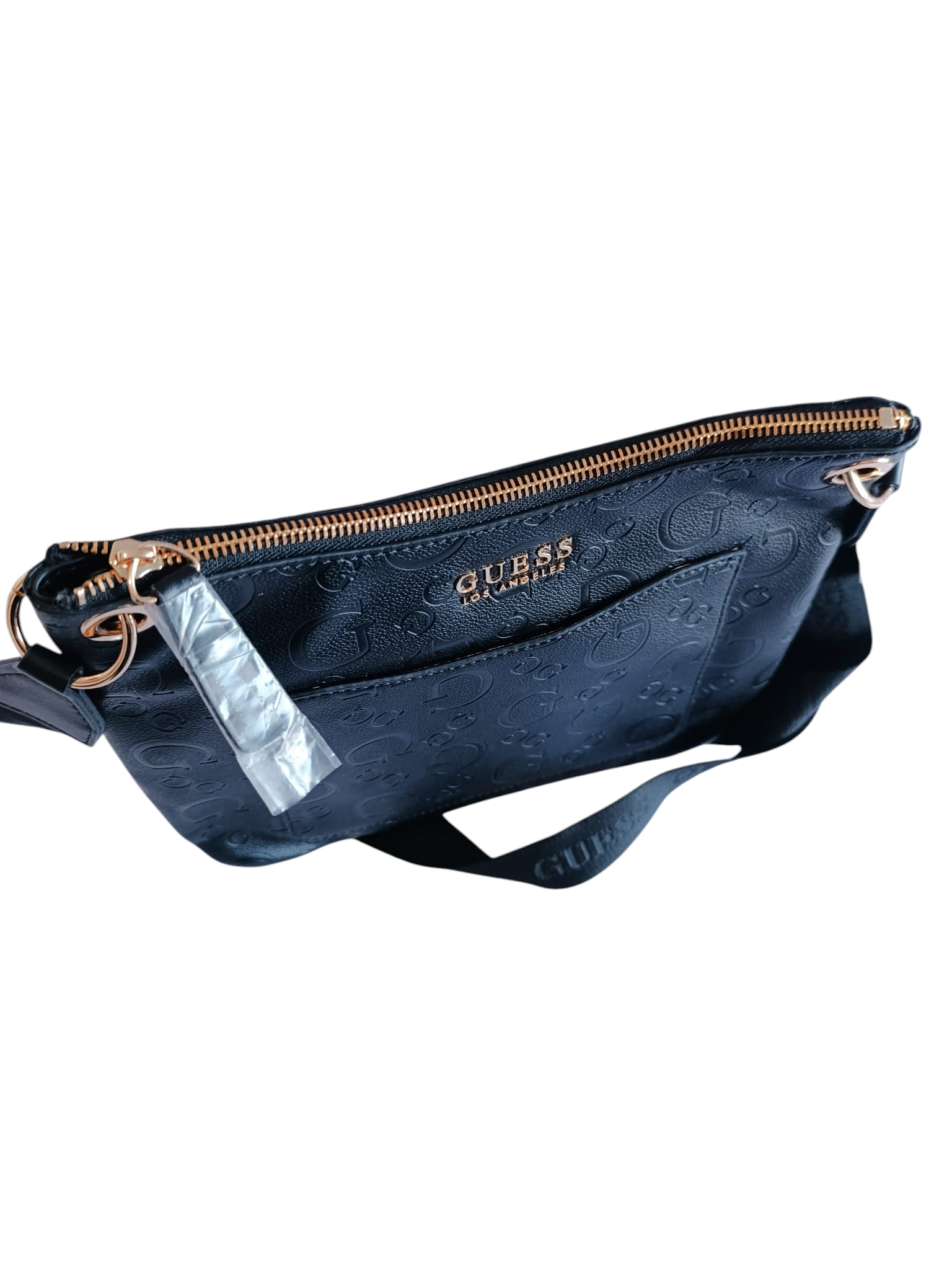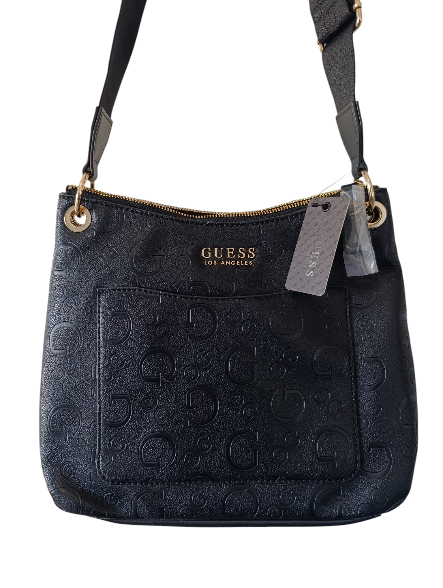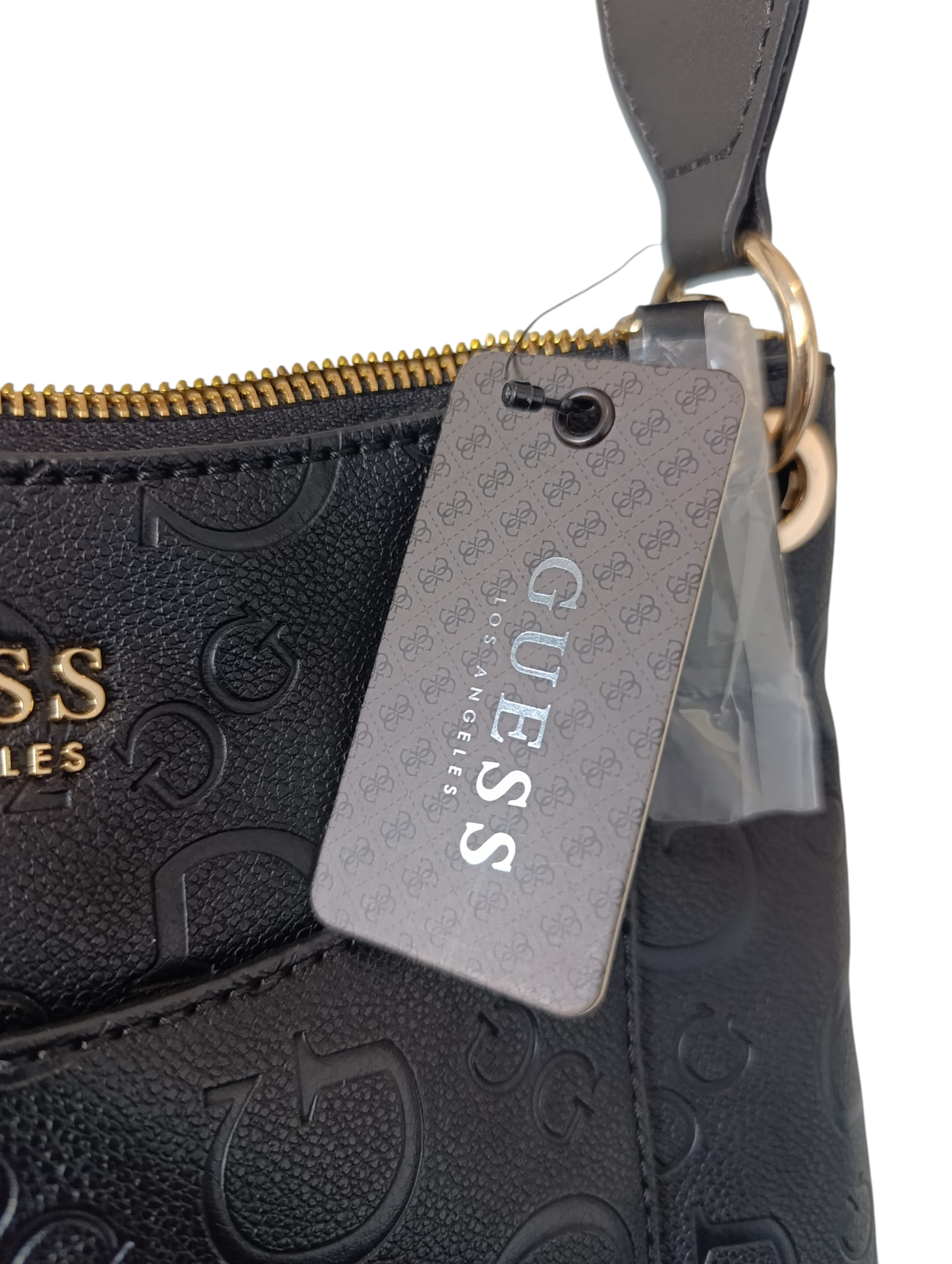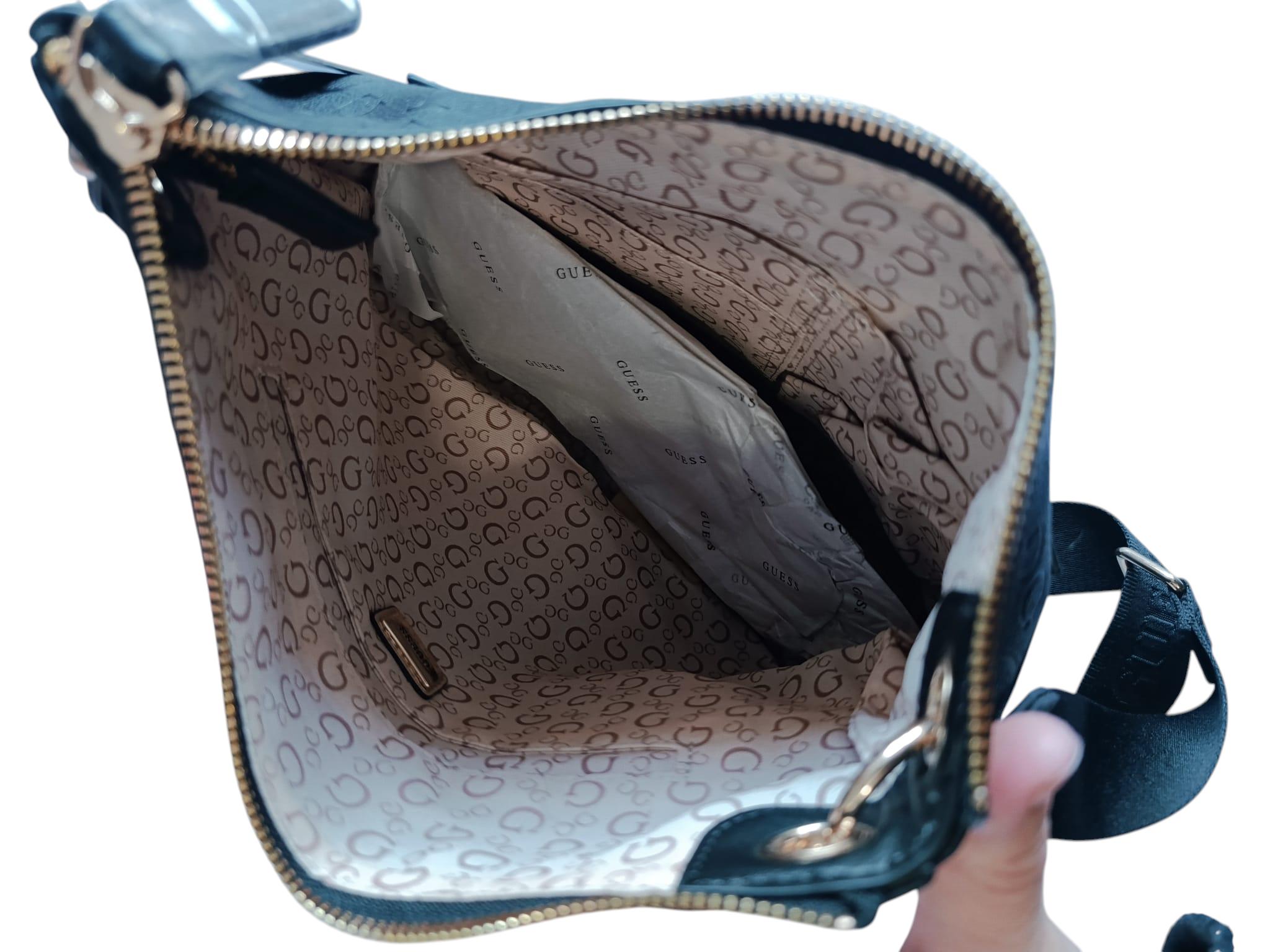 Bolso Guess negro con logo grabado en relieve, bandolera ajustable y acabados dorados. Elegante, práctico y perfecto para el uso diario.