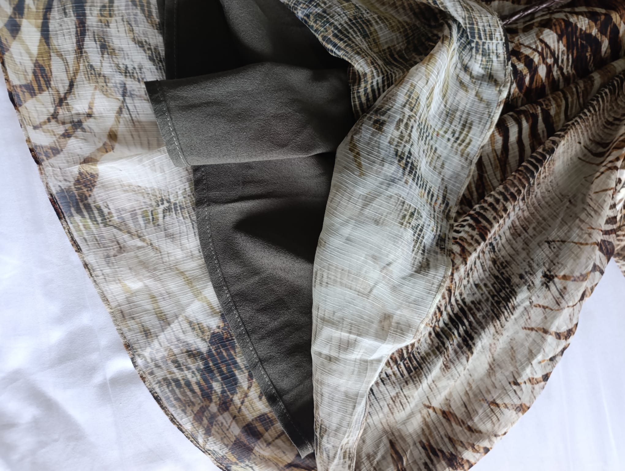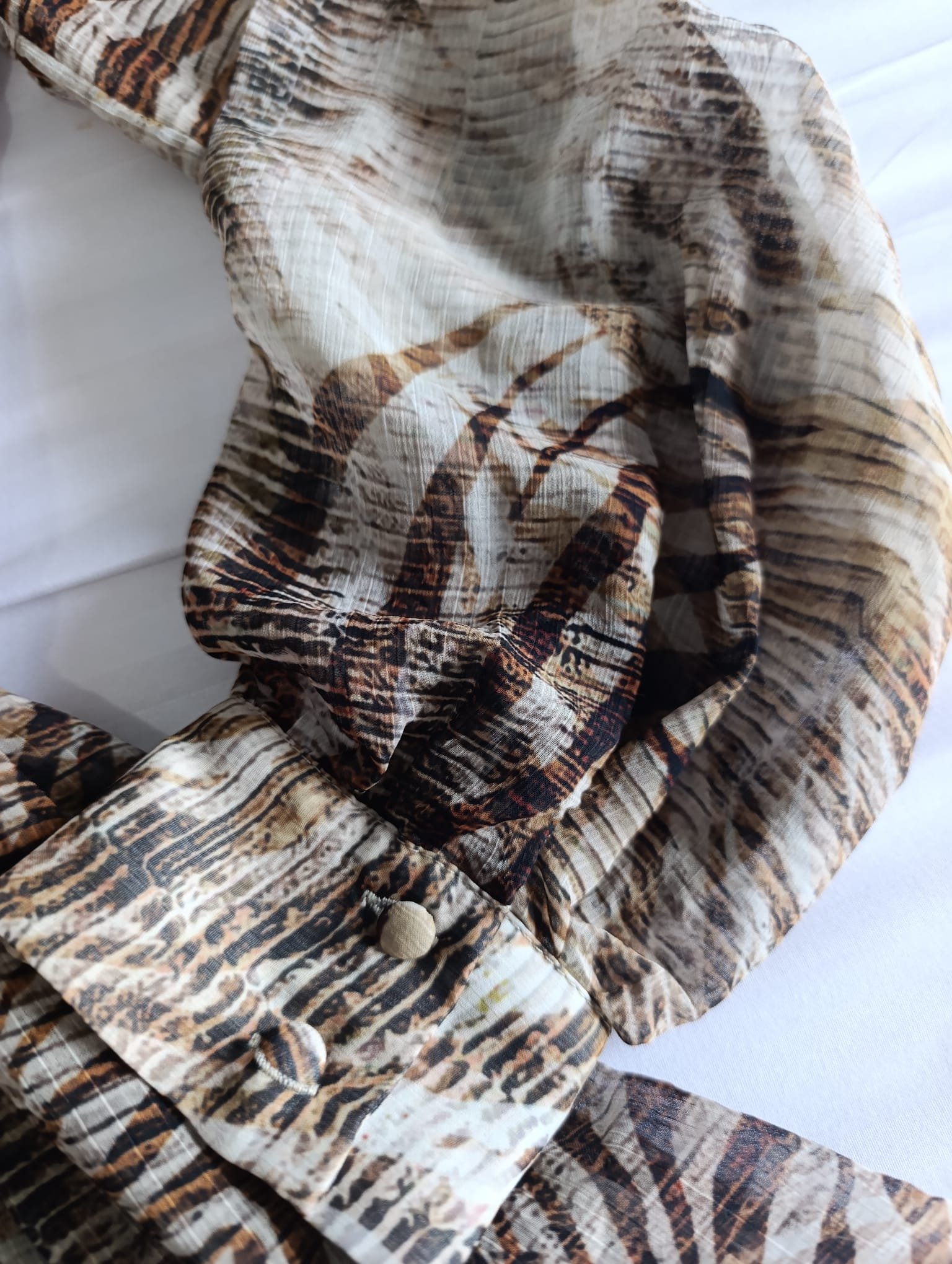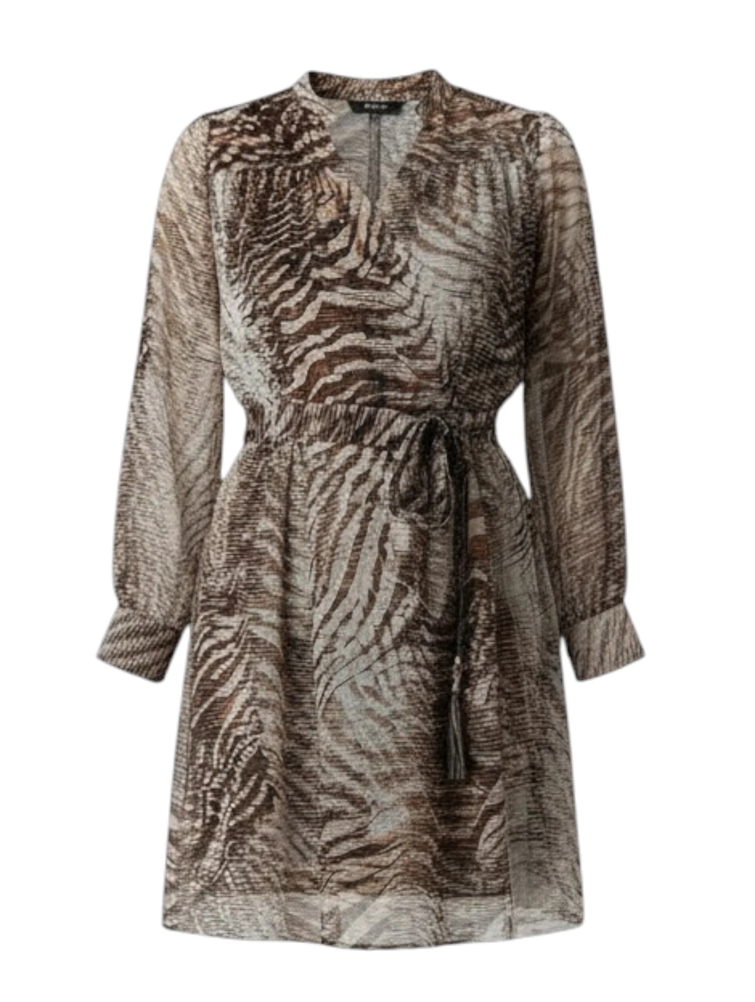 El escote en V y las mangas largas con puño fruncido aportan un toque sofisticado, perfecto tanto para looks de día como para ocasiones más especiales. Un diseño versátil que destaca por su estampado en tonos tierra y su acabado de calidad, característico de la firma.