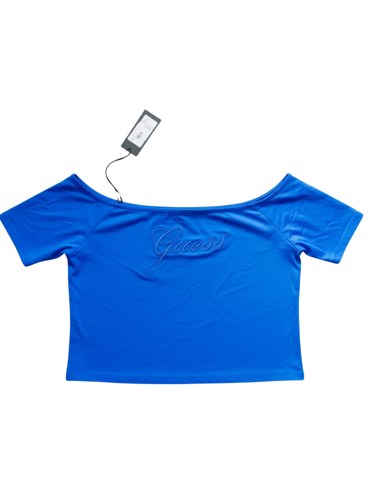 Top Guess azul cropped palabra de honor con logo bordado. Tejido elástico y cómodo. Ideal para looks casuales y modernos.